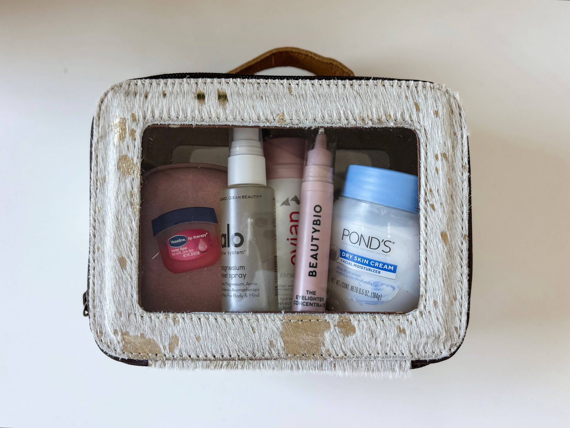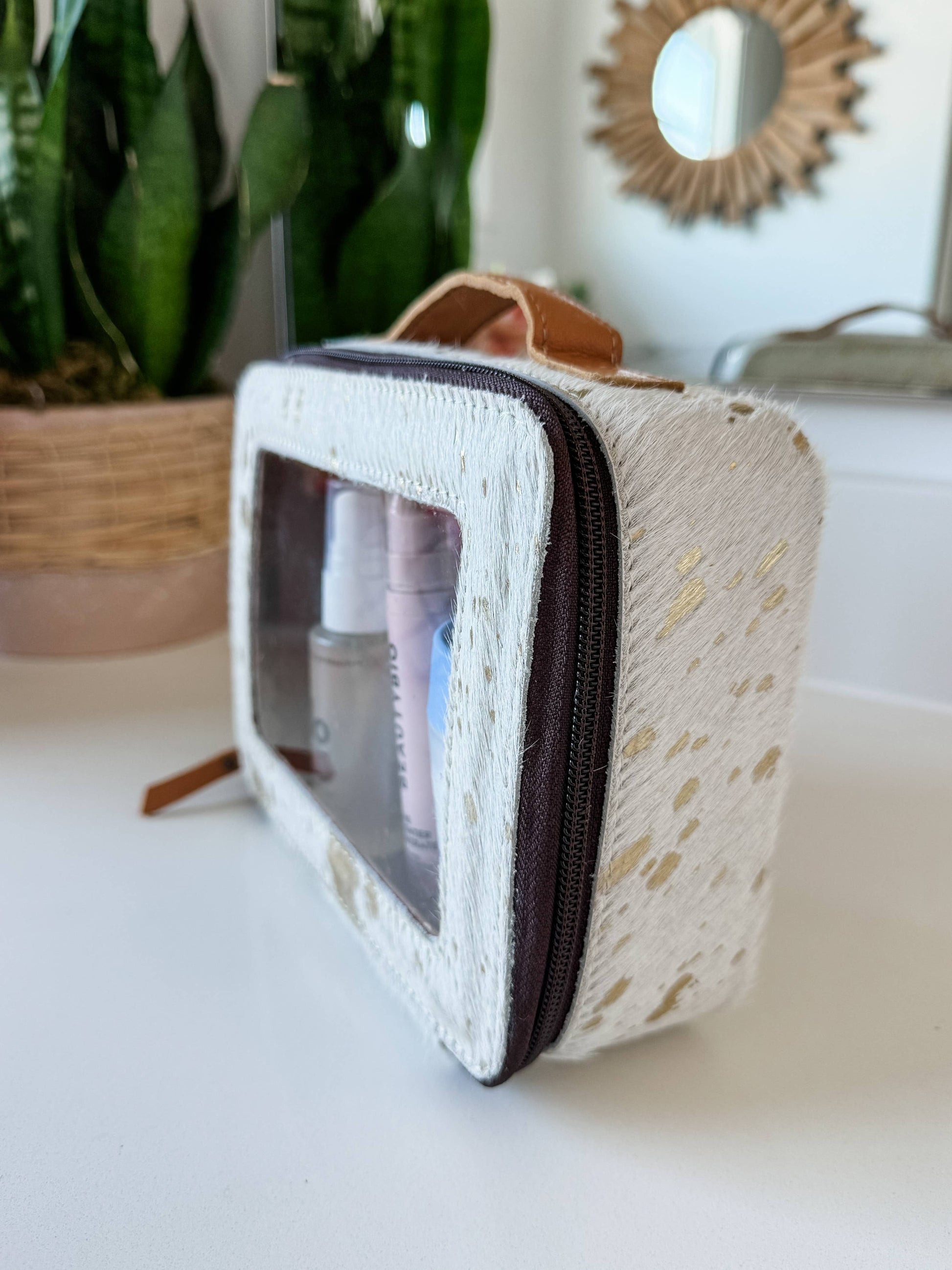 These clear makeup and toiletry bags are simply stunning and perfect for gifting or travel! Made from genuine hair-on cowhide with cowhide accents on the bottom, sides, and top, each bag is unique. It features a leather handle for easy carrying, a polyester-lined interior, and a leather tassel zipper pull. Measuring about 8”L x 6”H x 2.5”W, the clear PVC window lets you see what’s inside. Pick your favorite color, and we’ll send you a one-of-a-kind bag with charming natural variations in the leather. Perfect for adding a little Western flair to your routine!