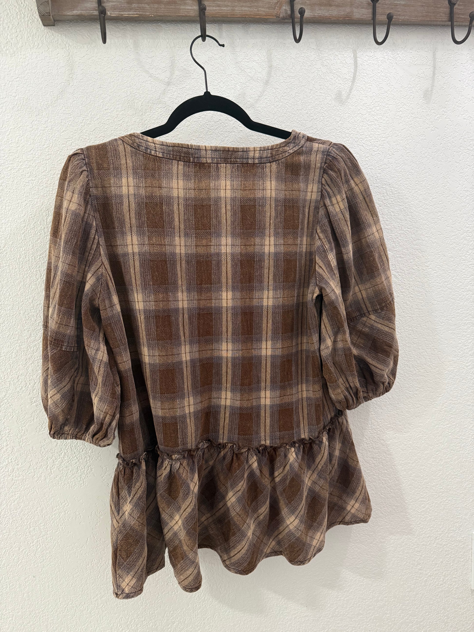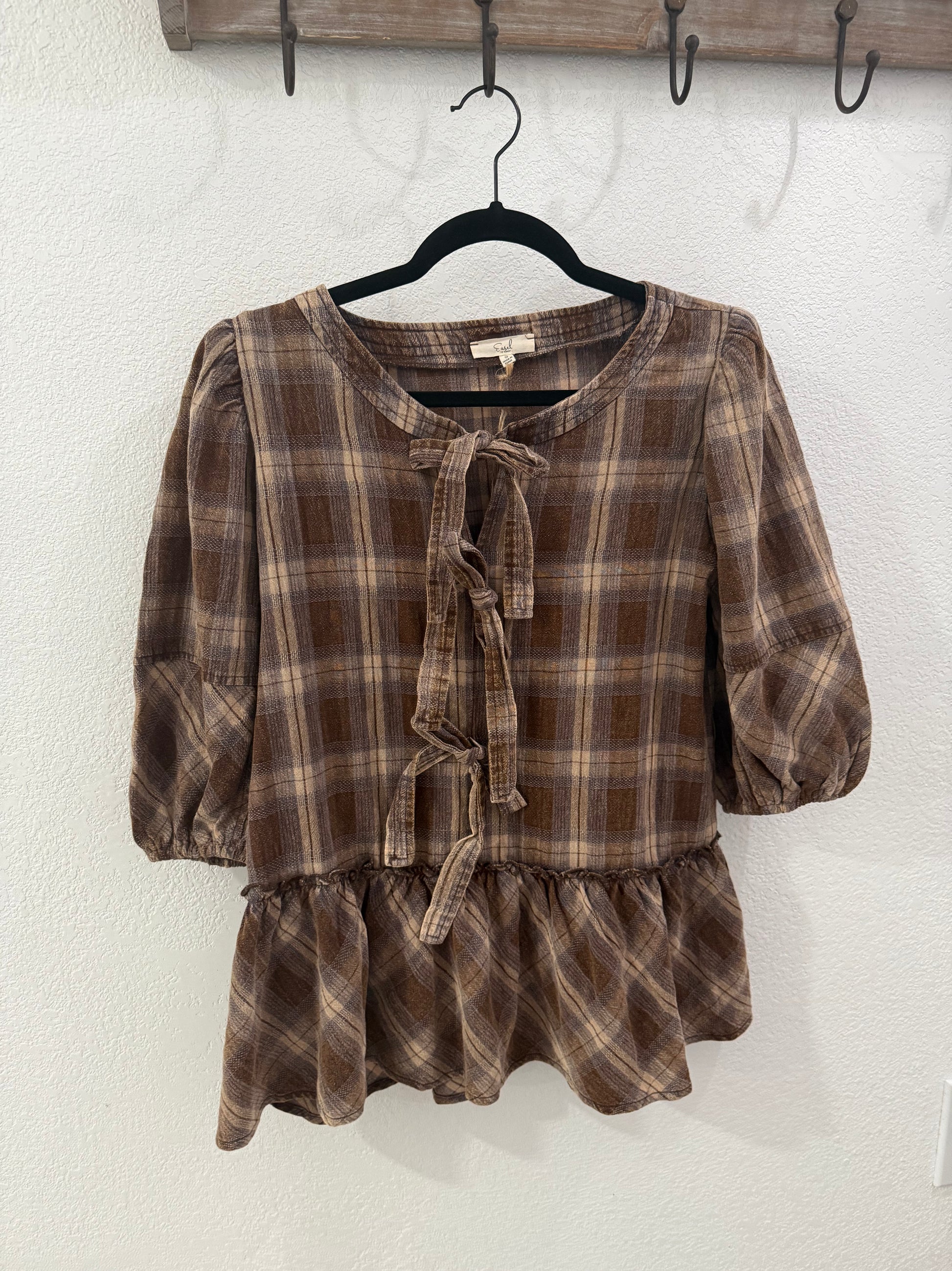 "Elevate your fall wardrobe with our Washed Plaid Tie-Front Peplum Blouse. In a unique, coffee color and featuring a cute tie-front detail, this blouse will have you looking stylish and trendy. The peplum design adds a playful touch, making it the perfect top for any occasion."